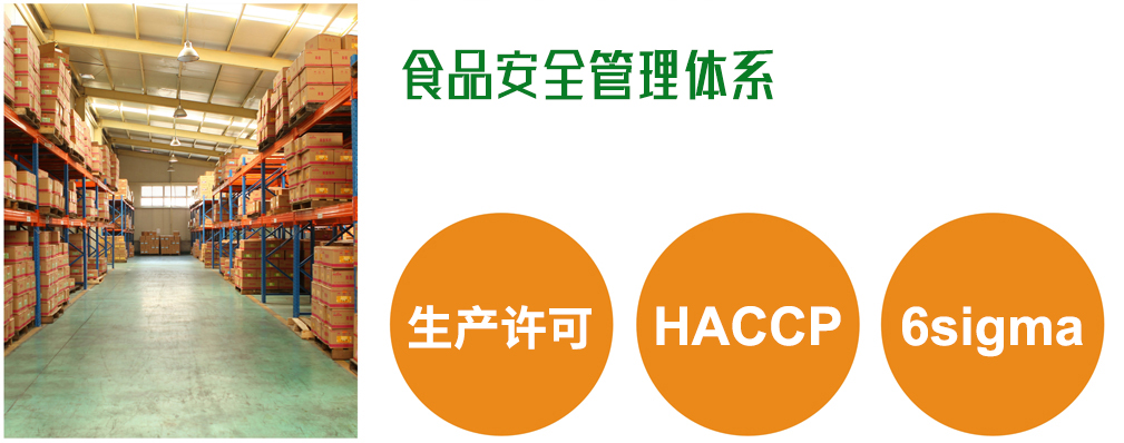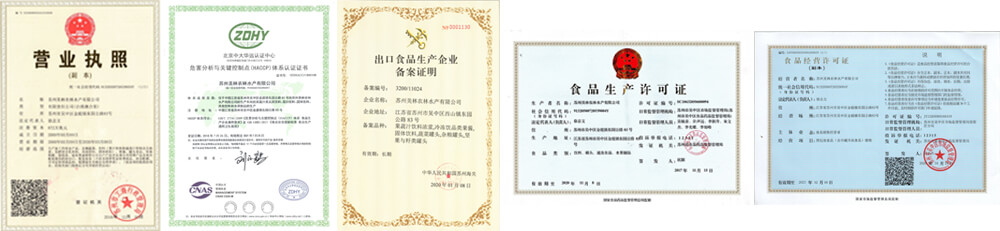公司资质齐全,包括食品生产许可、出口备案以及HACCP体系认证等。企业运行食品安全管理体系和生产安全管理体系,以生产安全为保障,以食品安全为根本,以产品研发为动力,以客户至上为核心。